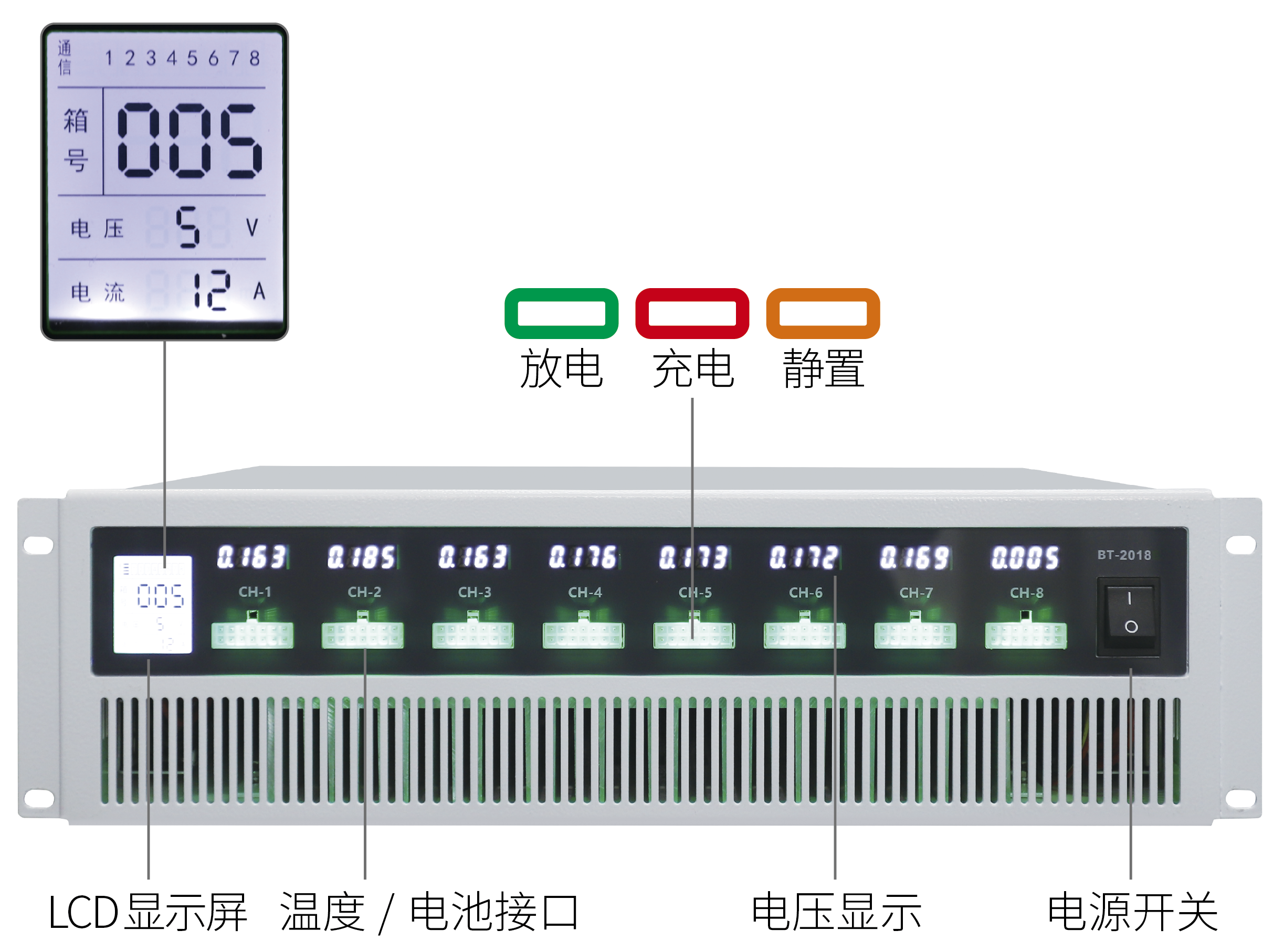 1、每個電池接口端配備一個電壓表,用來實(shí)時顯示電池電壓,在接入電池時,可以判斷電池是否接入正確;