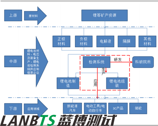 鋰離子電池產(chǎn)業(yè)鏈上游為:鋰礦產(chǎn)資源--中游為鋰電池材料--電芯生產(chǎn)--電芯生產(chǎn)裝備--鋰電池檢測系統(tǒng)提供商和鋰電池組裝企業(yè)--下游主要是鋰電池配套應(yīng)用領(lǐng)域,包括 3C 產(chǎn)品、電動(dòng)工具、電動(dòng)自行車、新能源汽車、儲(chǔ)能等行業(yè)。